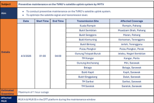 MAINTENANCE ALERT: MYTV will be conducting maintenance on 4th March 2026, 01:00 a.m. to 04:00 a.m. Expect broadcast interruptions. For assistance, call 1300-80-6988.
